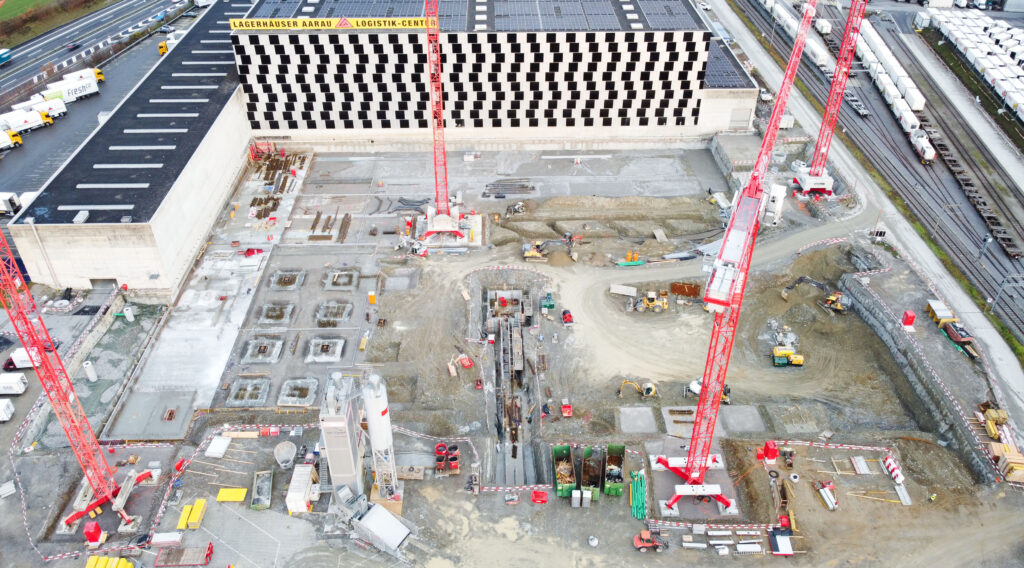 Besondere Aufmerksamkeit galt der Stabilisierung des angrenzenden Hochregallagers. Präzise bautechnische Massnahmen stellen sicher, dass der laufende Betrieb ohne Einschränkungen weitergeführt werden kann. Dies ist ein Balanceakt zwischen Neubau und laufendem Logistikbetrieb.